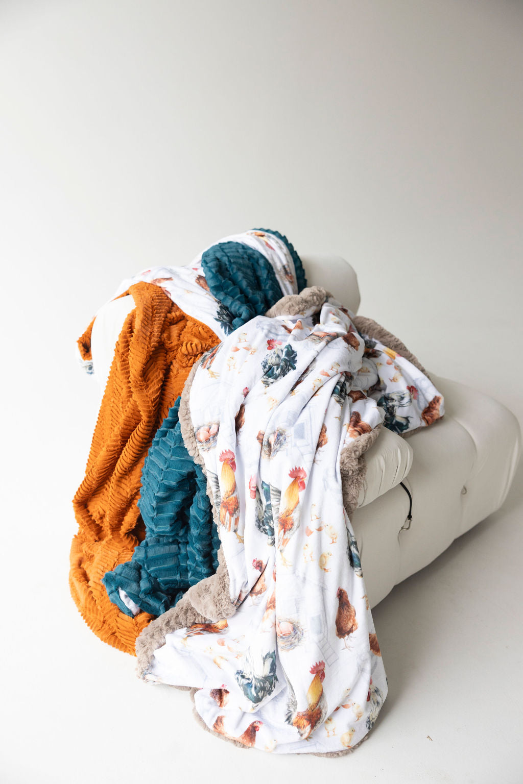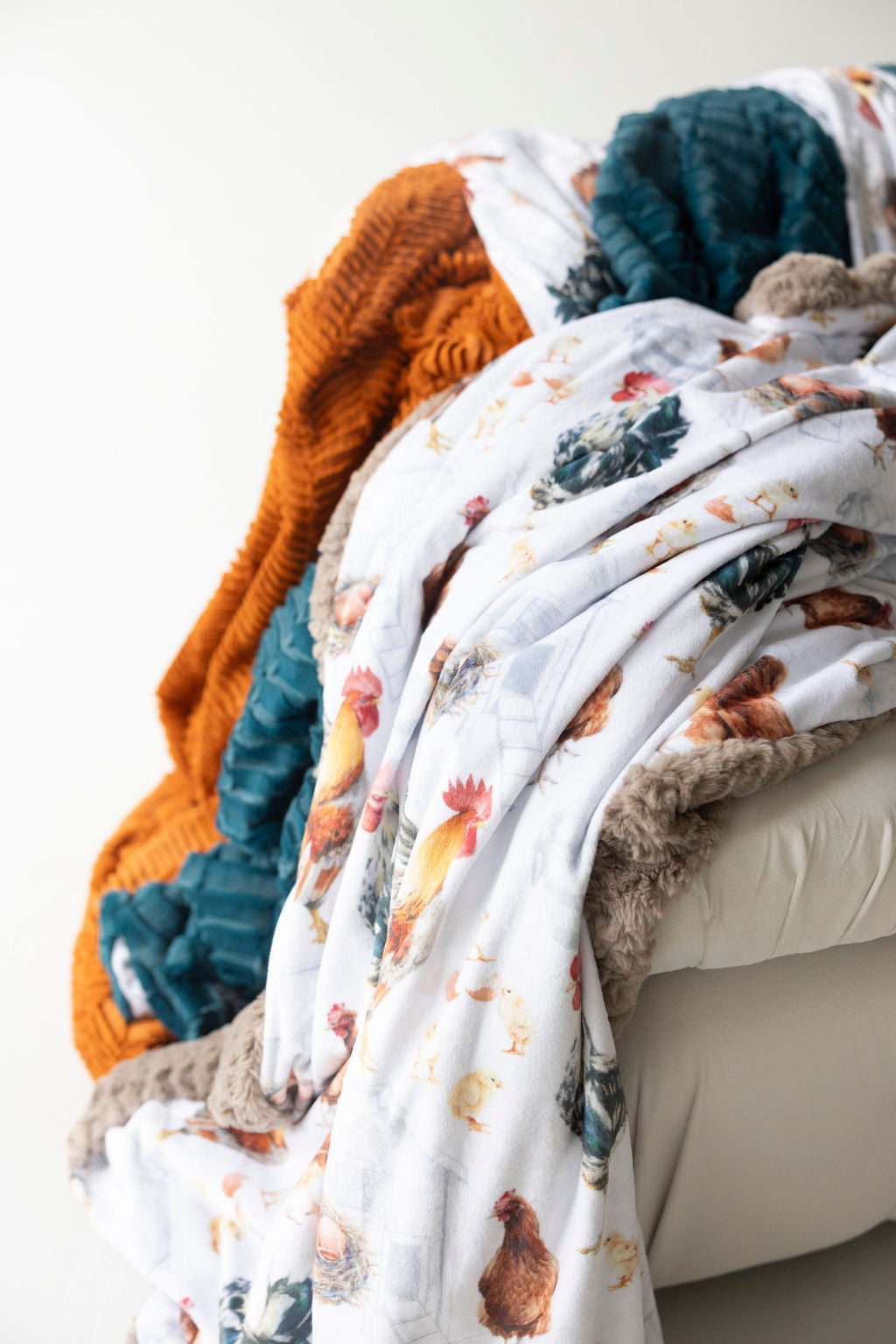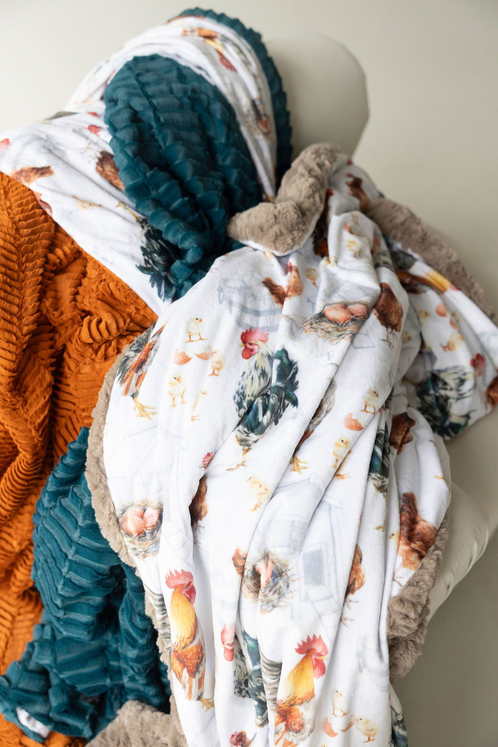 • Material: Double-sided premium minky (chicken and egg print front + coordinating plush backing)