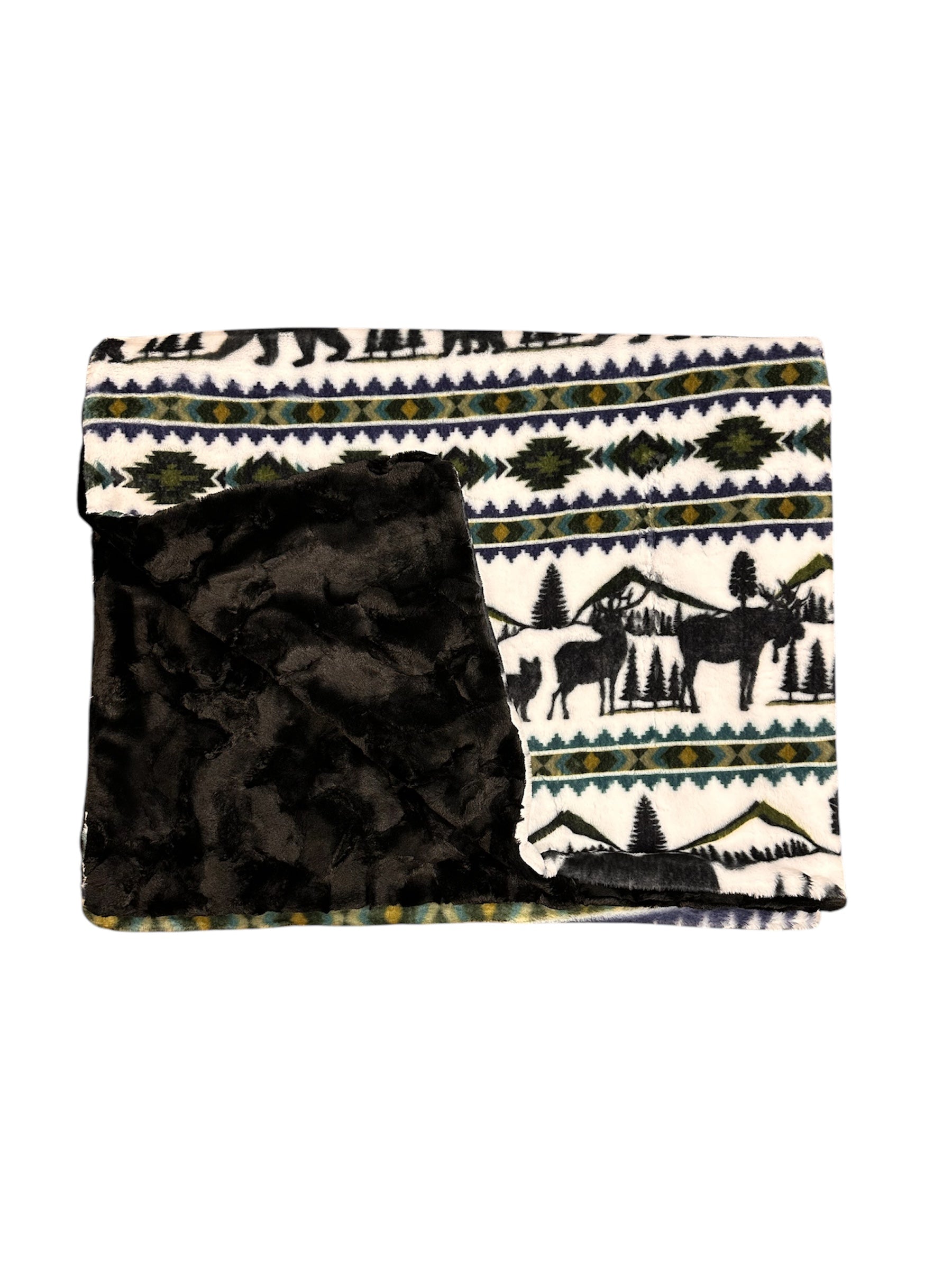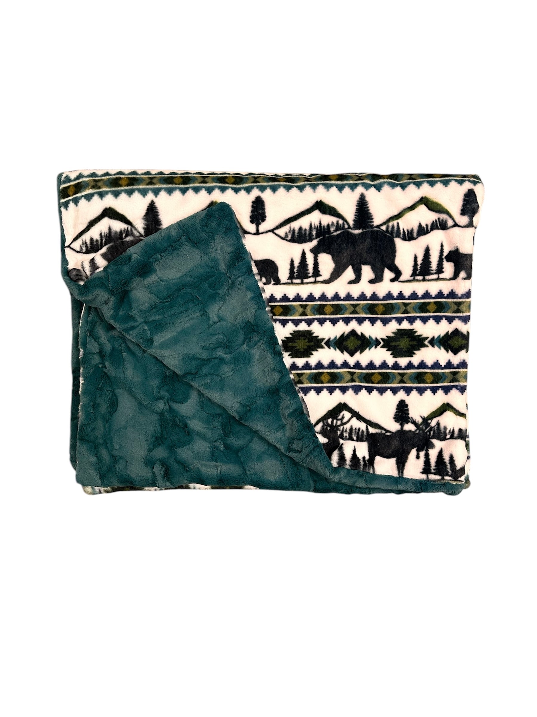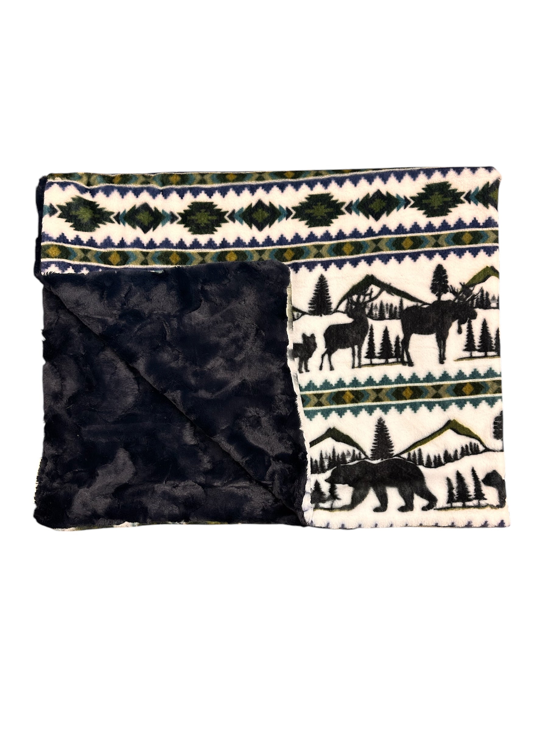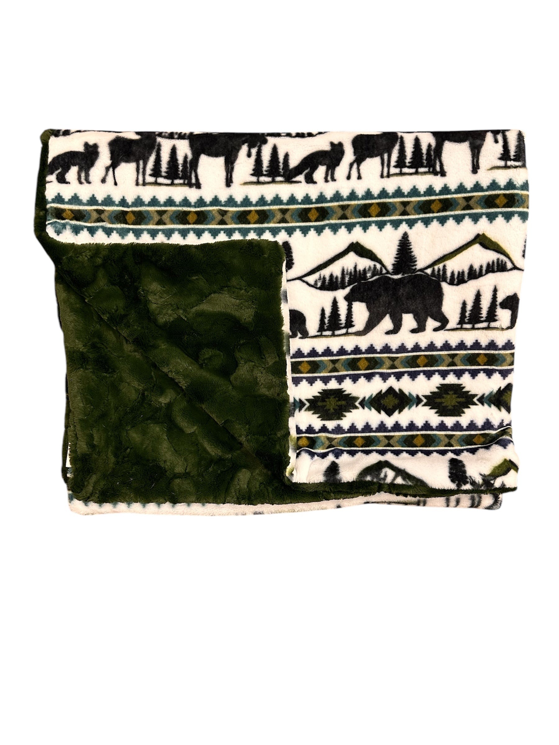 Our Bear Creek Haven Blanket captures the rugged beauty of the great outdoors, featuring majestic moose, towering pine trees, and wandering bears set against a nature-inspired backdrop. Paired with an ultra-soft, dark plush minky backing, this double-sided blanket is built for warmth, comfort, and the spirit of adventure.