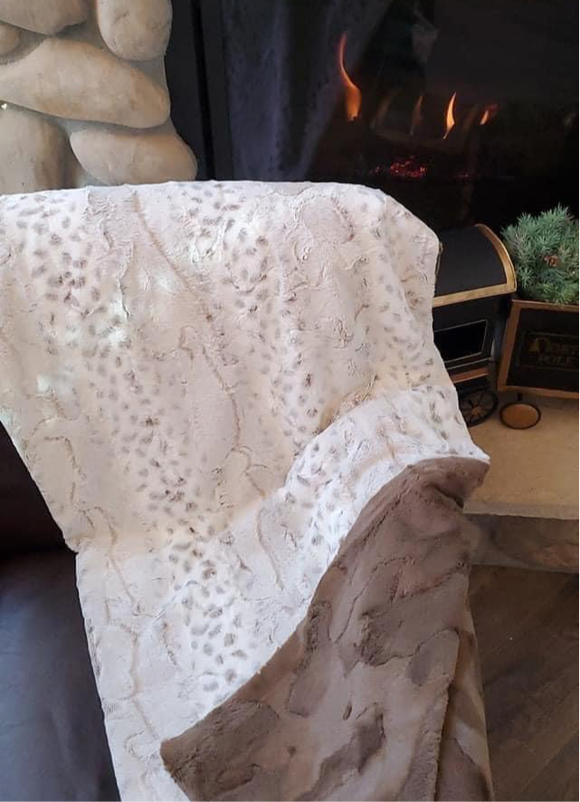 Esta hermosa manta presenta un estampado de lince en colores naturales en un lado y un lujoso color marrón chocolate, un bronceado cremoso claro o un color topo en el otro.