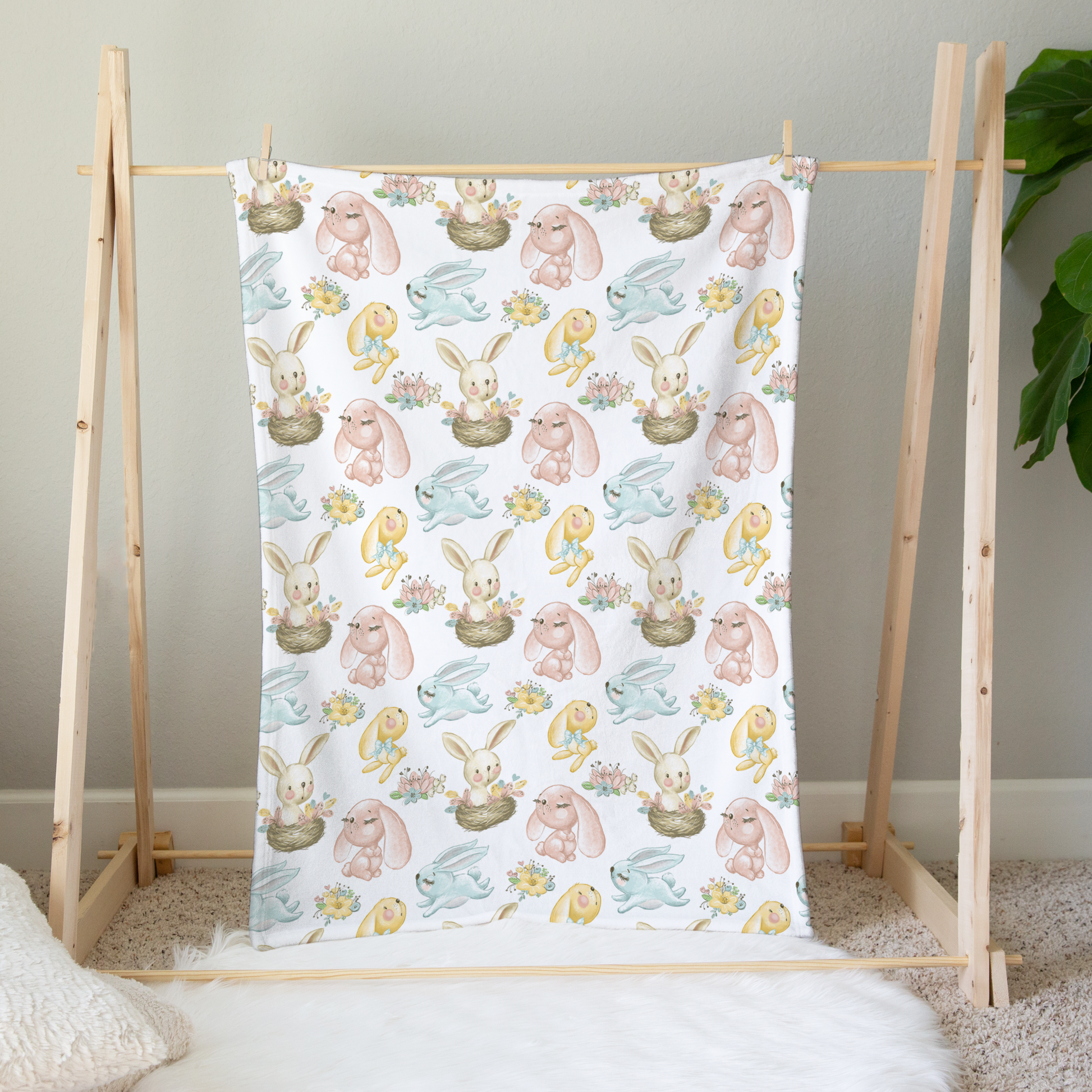 Our Bunny Meadow Petite Embrace Blanket features our own exclusive bunny-themed design—filled with sweet, playful rabbits and delicate, nature-inspired details.