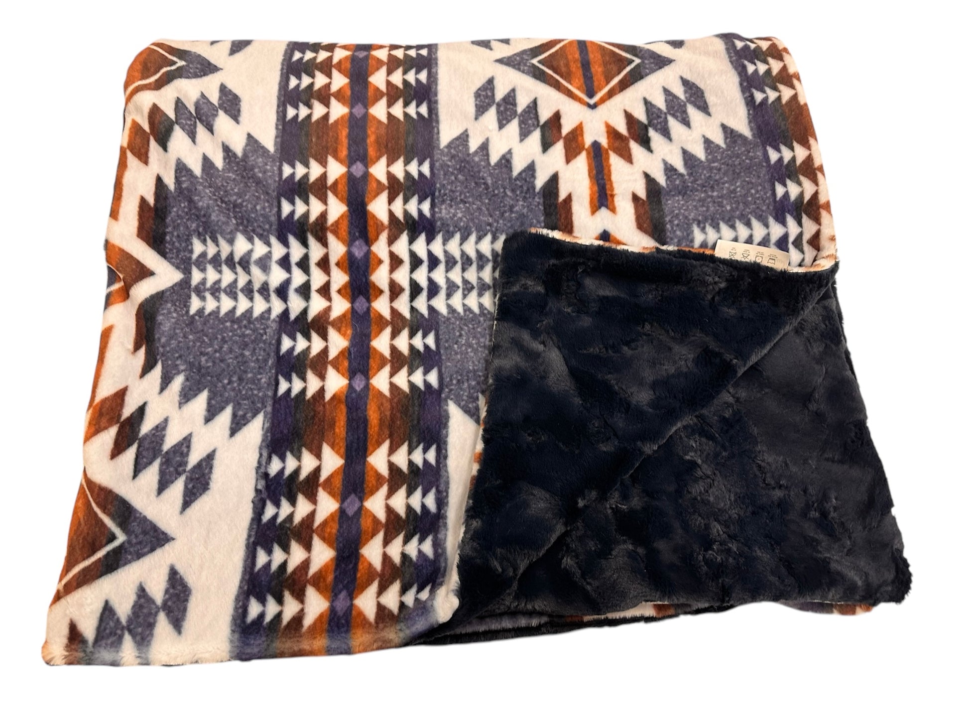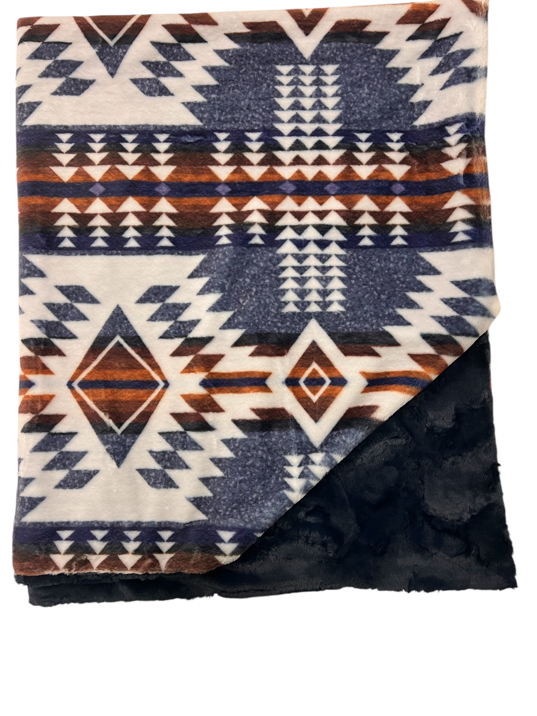 - Material: Double-sided premium minky (earthy geometric front, velvety navy back)