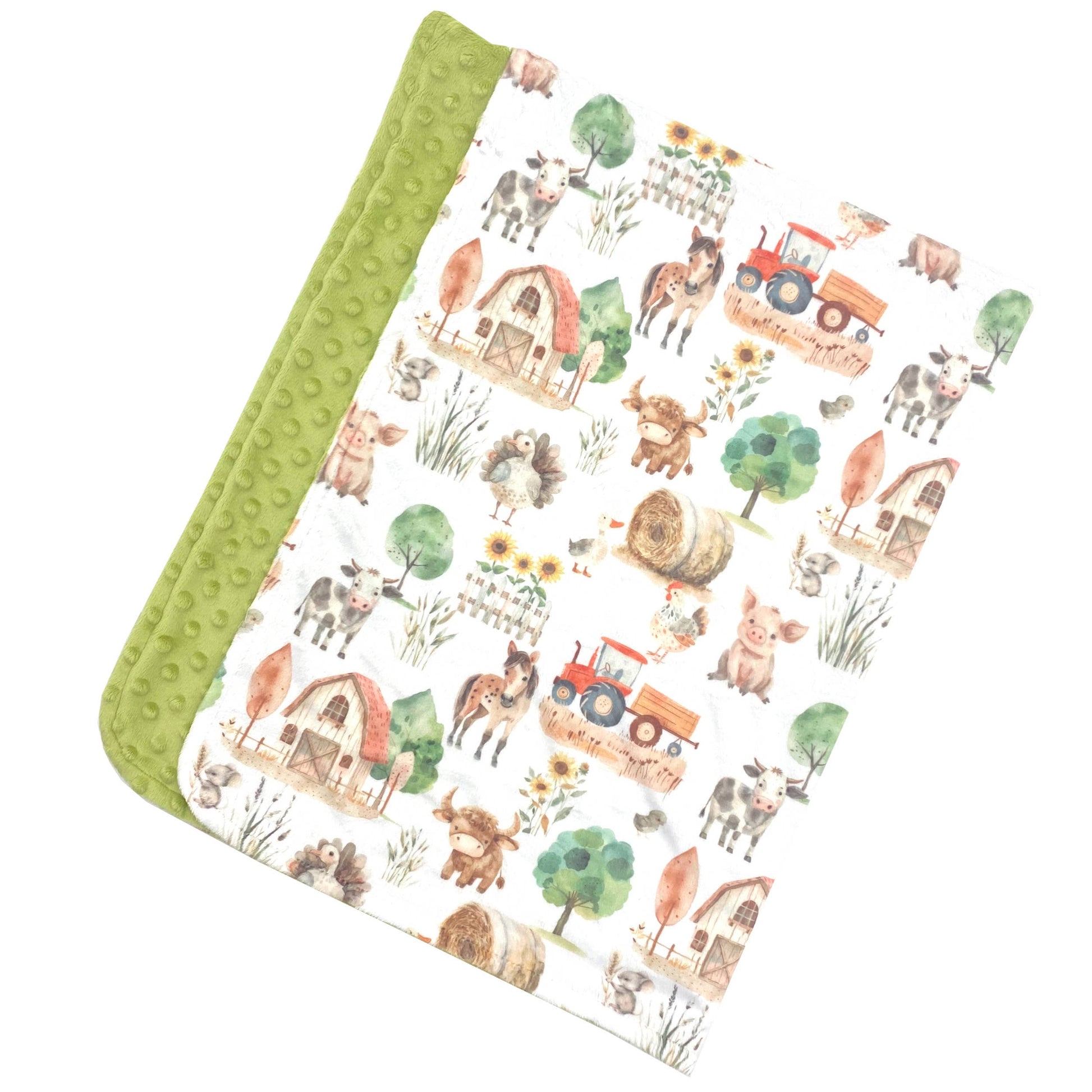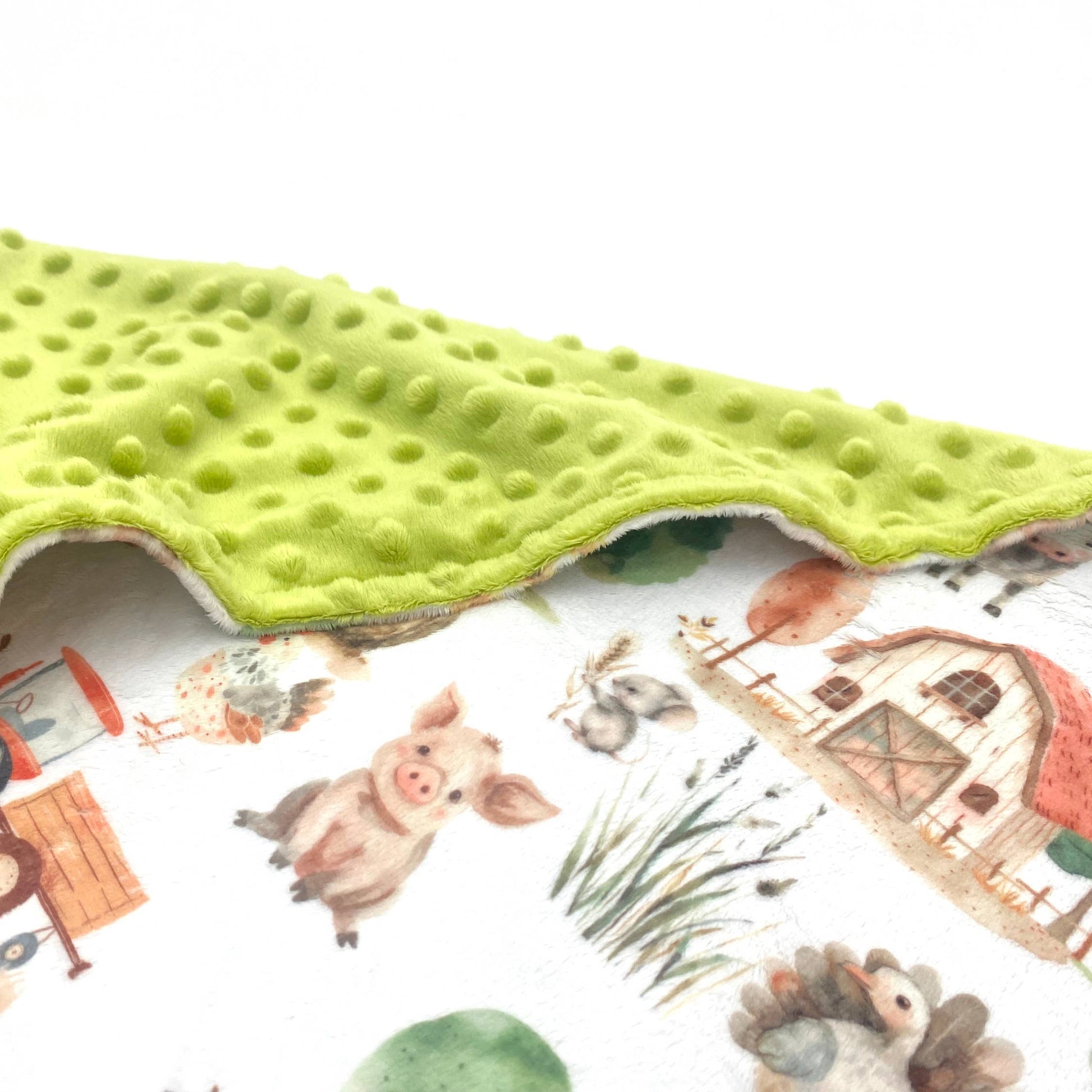 • Material: Double-sided premium minky (exclusive farm animals print + textured minky dot back)
