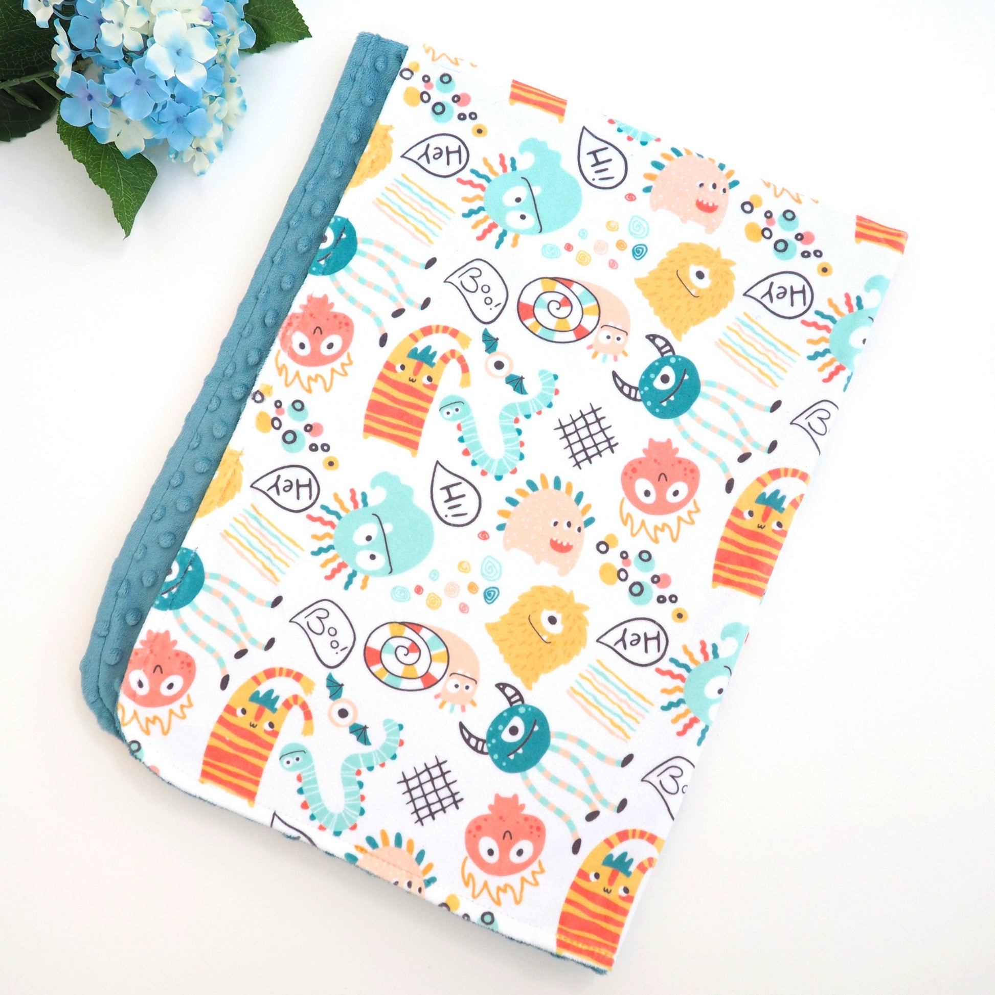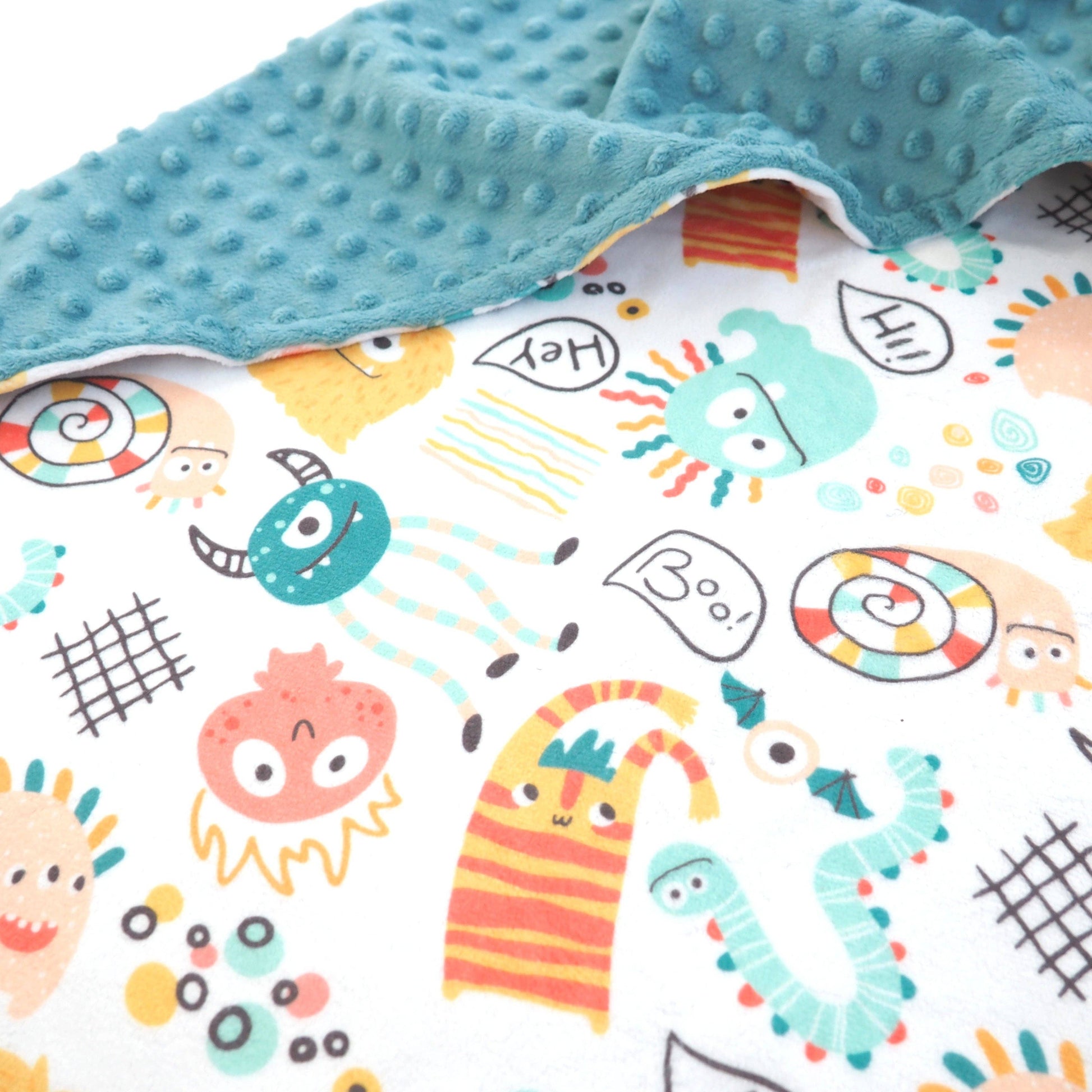 - Material: Double-sided premium minky (exclusive monster party print + textured minky dot back)